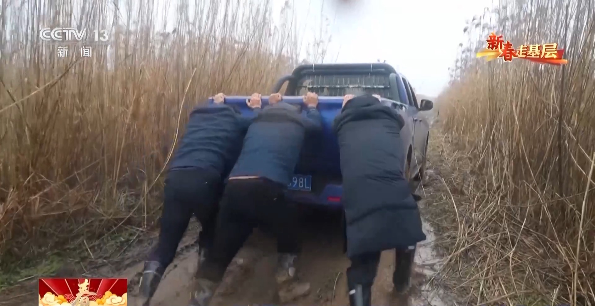 泥浆溅满所有人的裤腿和鞋子,众人合力好不容易把车推出了泥潭,赶到了小天鹅被困的水域。